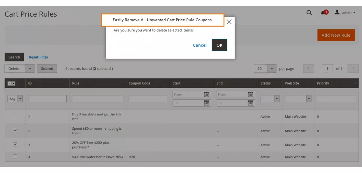 Check the boxes you want to remove from your cart price rules and press the OK button to confirm removing the selected cart price rules for Magento 2 store.