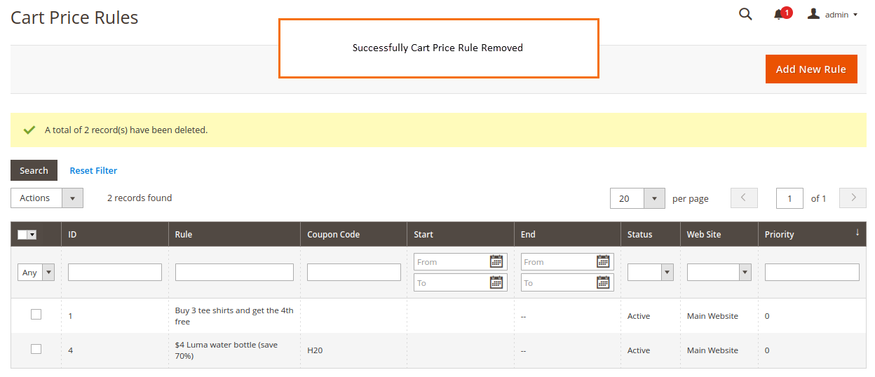 A message will appear at the top which confirms the removal of the selected cart price rule records effectively.