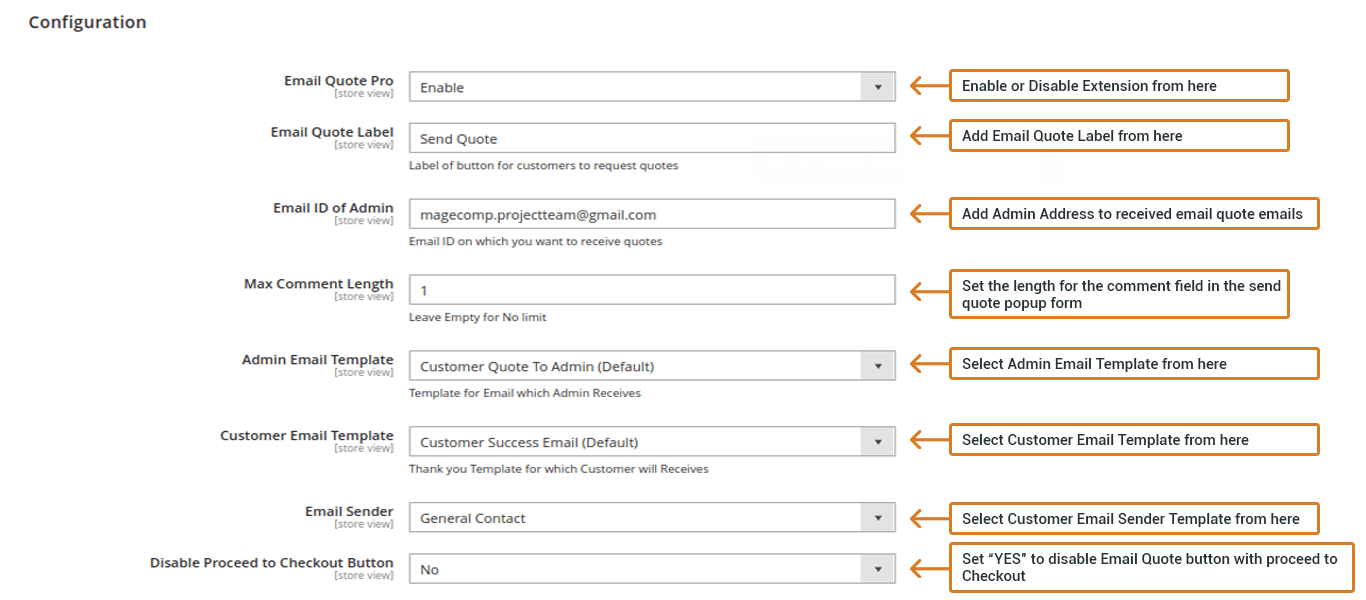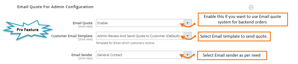 Email Quote Pro: Option to enable or disable the extension. Set this enable if you require to use the Email quote system for backend orders.