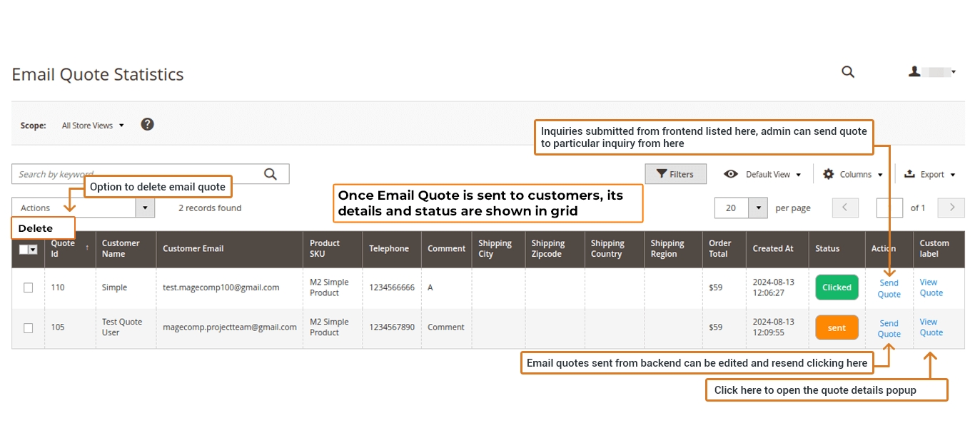 Inquiries submitted from frontend are listed in the action tab beside the status tab. Admin can send quote to particular inquiry from there. Also, from the actions bar at the top left side, option is provided to delete the old email quotes.