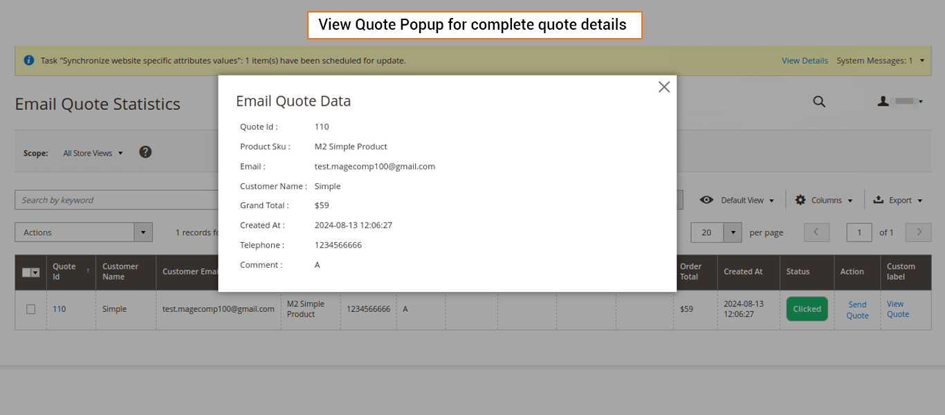 Once Email Quote is sent to your customers, the quote details and status are stored in backend with information of customer name, Email, product SKU, grand total, create date and status. The admin can easily edit created & sent quotes from backend by clicking on Edit button.