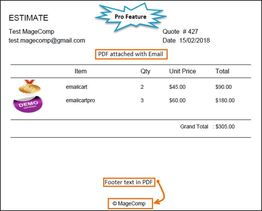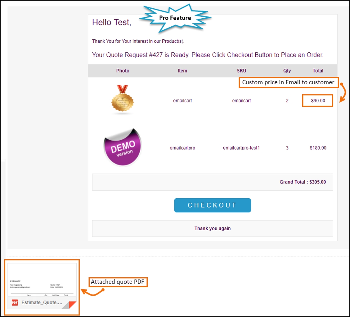 Once the admin has created a quote from the backend and sent a quote to the customer, the pro extension will automatically send one quotation email along with the attached PDF file copy to the customer if enabled.