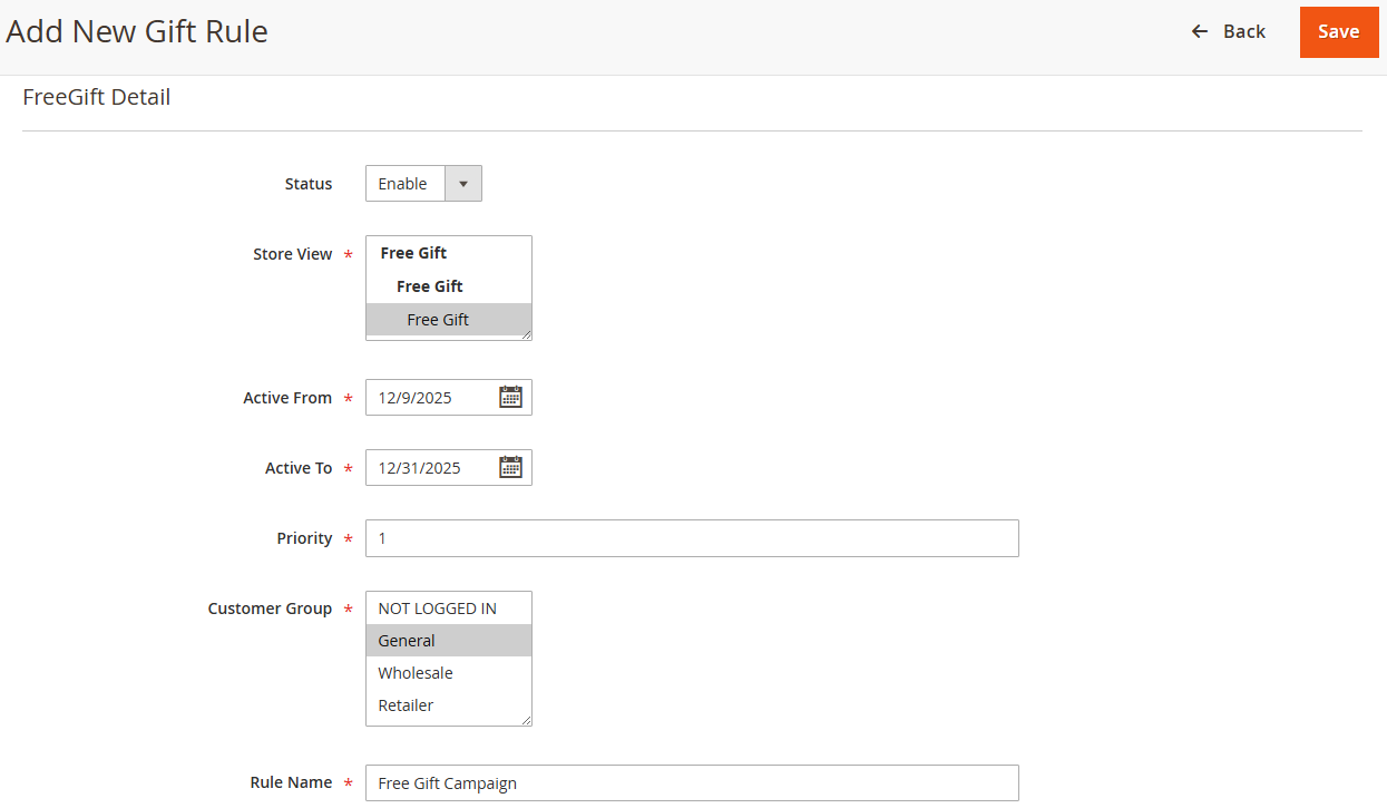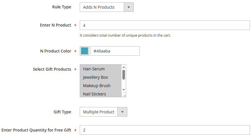 Note - The products which is set as Free Gift from the product edit page will be displayed in this multiselect list. Only simple products can be added as free gift.