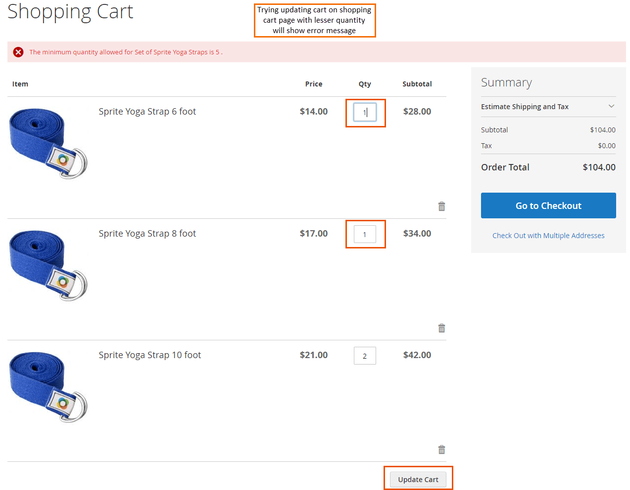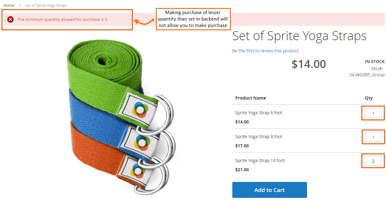 Even if you try editing product quantity from cart page, it flashes error message if the condition for minimum quantity is not satisfied.