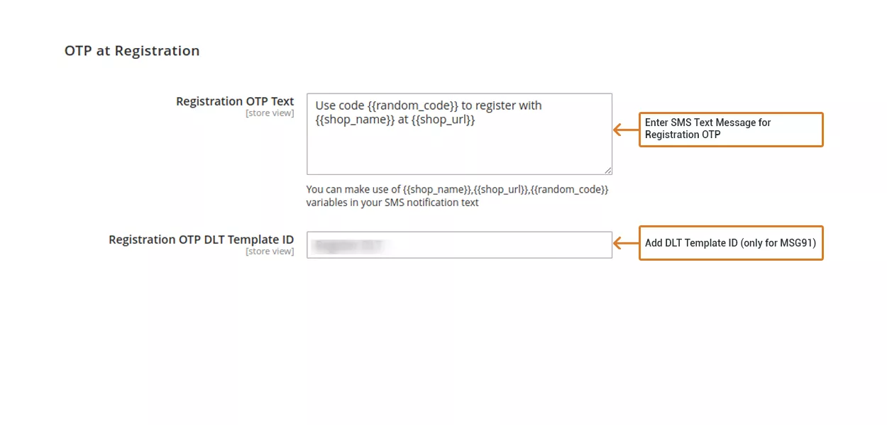 * **Registration OTP Text:** Enter a message to send to users when they register. The message will contain OTP for register verification.