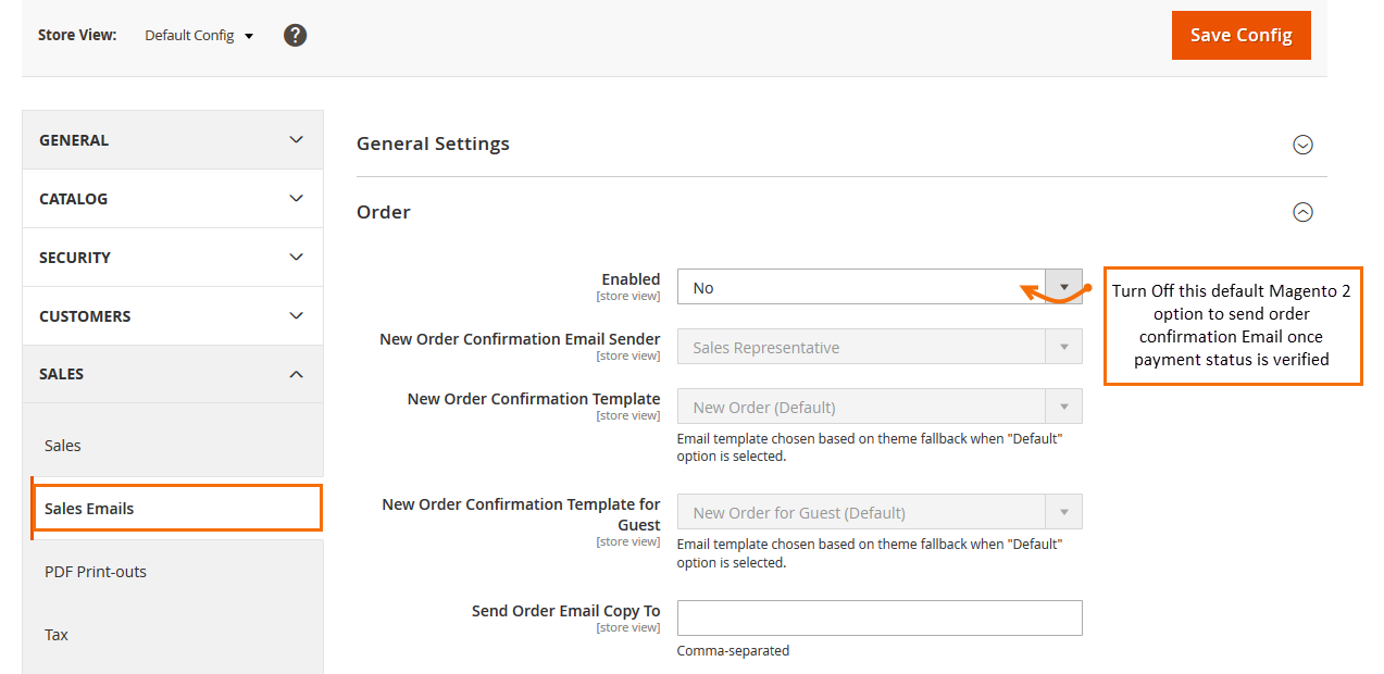 To use this extension, you must disable the default Order Email from your Magento 2 store backend to enjoy the extension functionality. Simply, navigate to Store -> Configuration -> Sales -> Sales email -> Order -> and set default Enabled option to “No” as shown below.