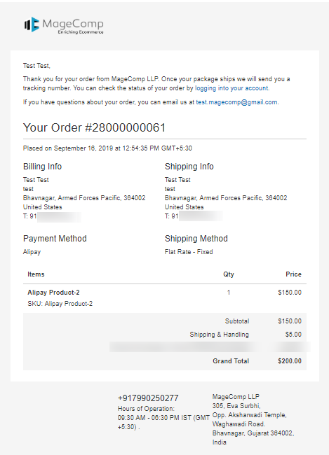 Once the extension verifies payment for the order, it will automatically send an order confirmation email to your customer as shown below.