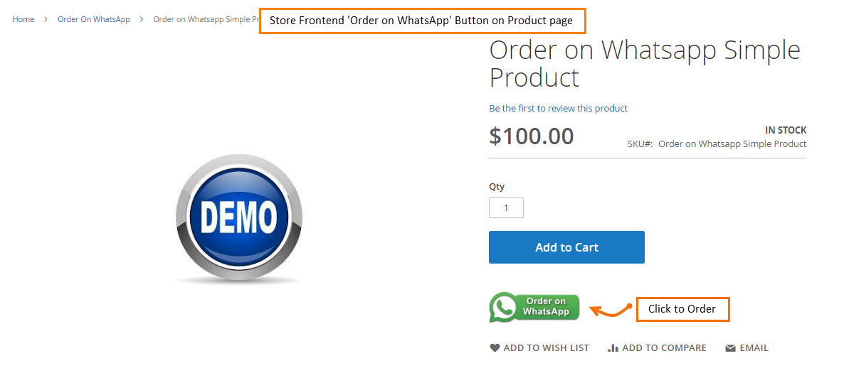 Once you have properly configured the extension from the backend, you can see ‘Order on WhatsApp’ button on store frontend product page.