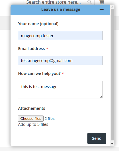 Quick Contact Form in the frontend where customers have to enter details like name, email address, message, and up to 5 files as attachments.
