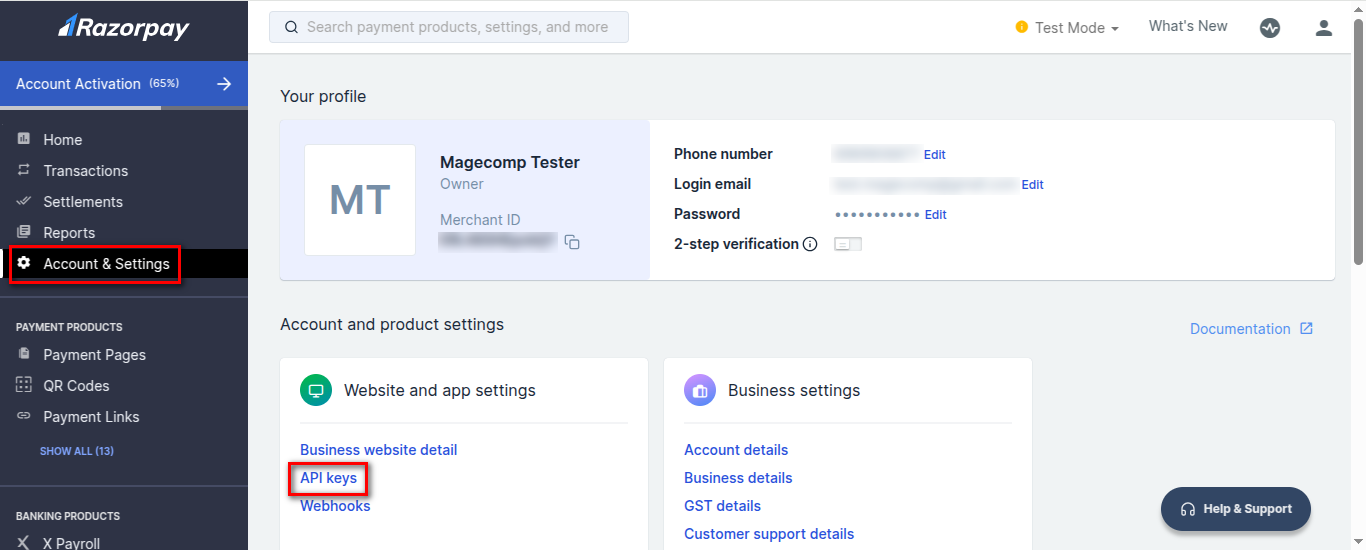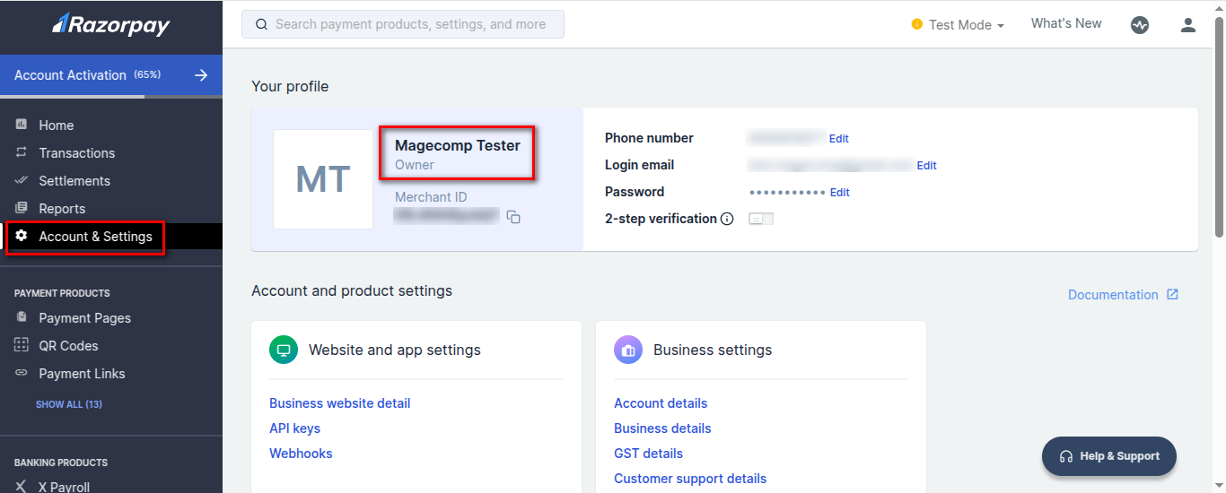 **Step 2:** Now, click on **Account & Settings** to get the Merchant Name.
