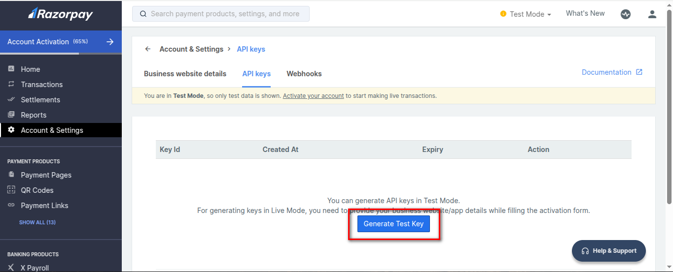 **Step 4:** Next, click on **Generate Test Key** to get the **API Key** and **Secret API Key**.