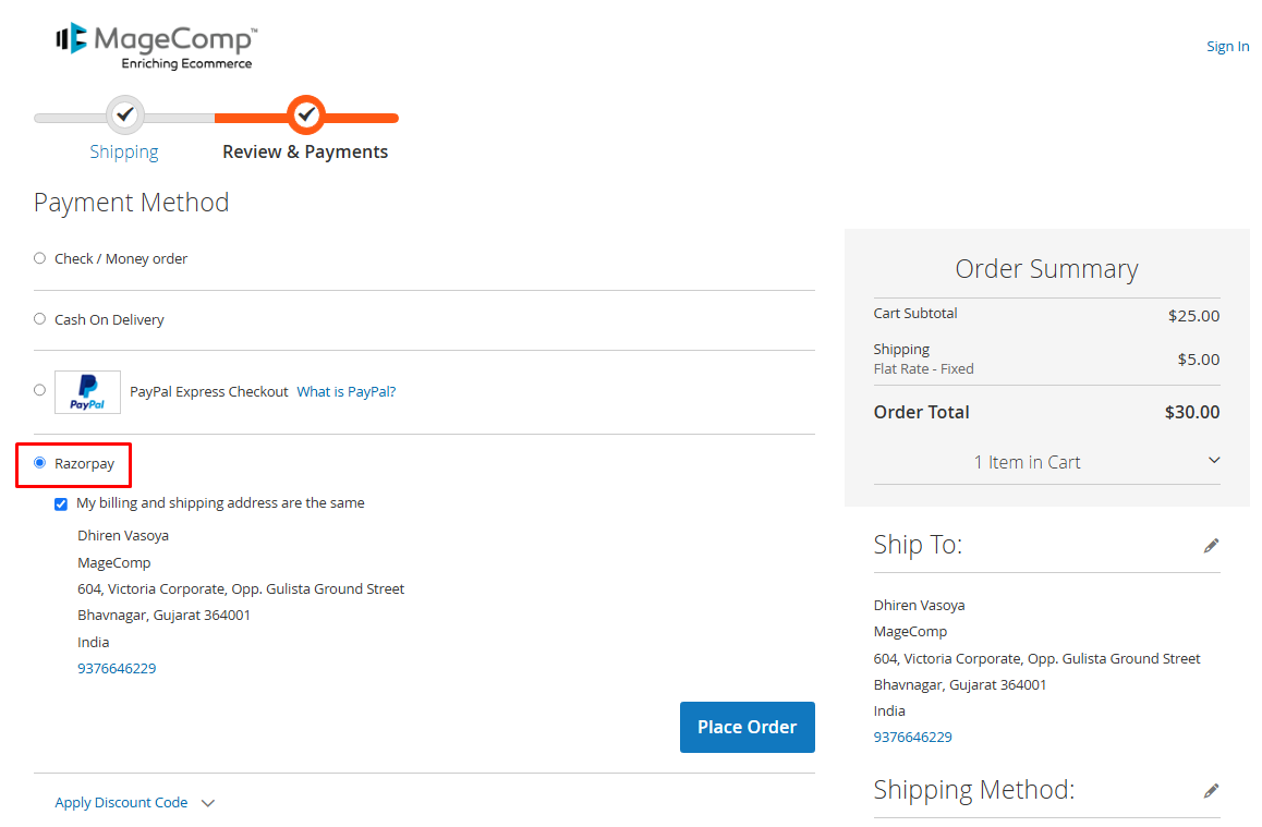 Once you apply the configuration settings for Razorpay, go to the frontend of your Magento 2 store. Add an item to the cart and proceed to checkout. You can see Razorpay is enabled in the frontend.