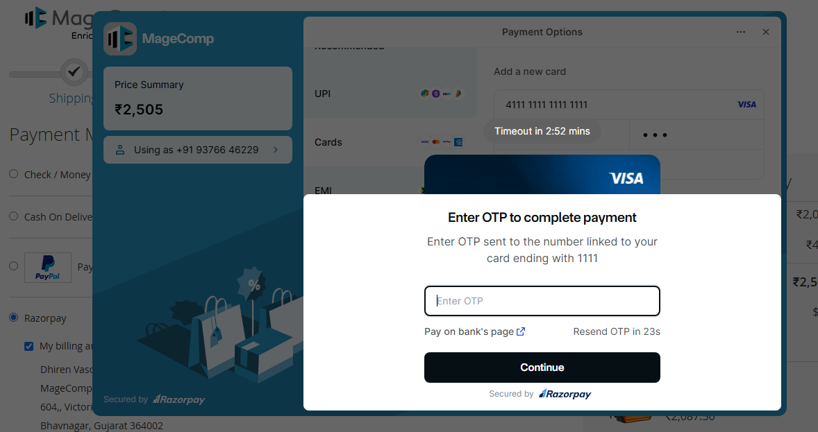 When you click on place order, it will redirect you to the Razorpay payment page, where you are asked to enter payment details.