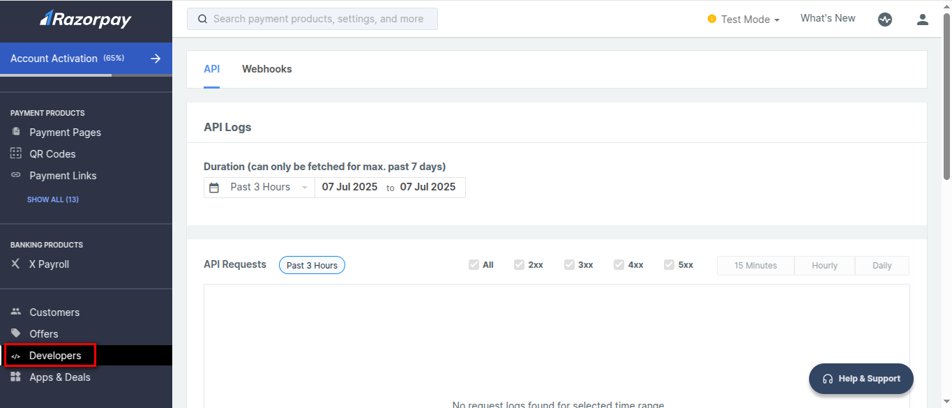 **Step 1:** From your Razorpay Account dashboard, click on **Developers**.