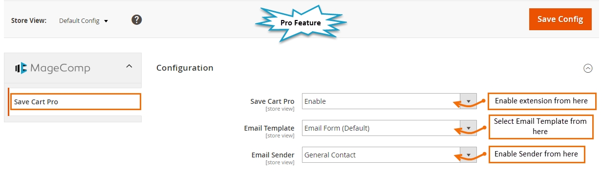 • Save Cart Pro: Option to enable or disable the extension. • Email Template: Select a template to send the cart to customers. • Email Sender: Select Email sender as per need.