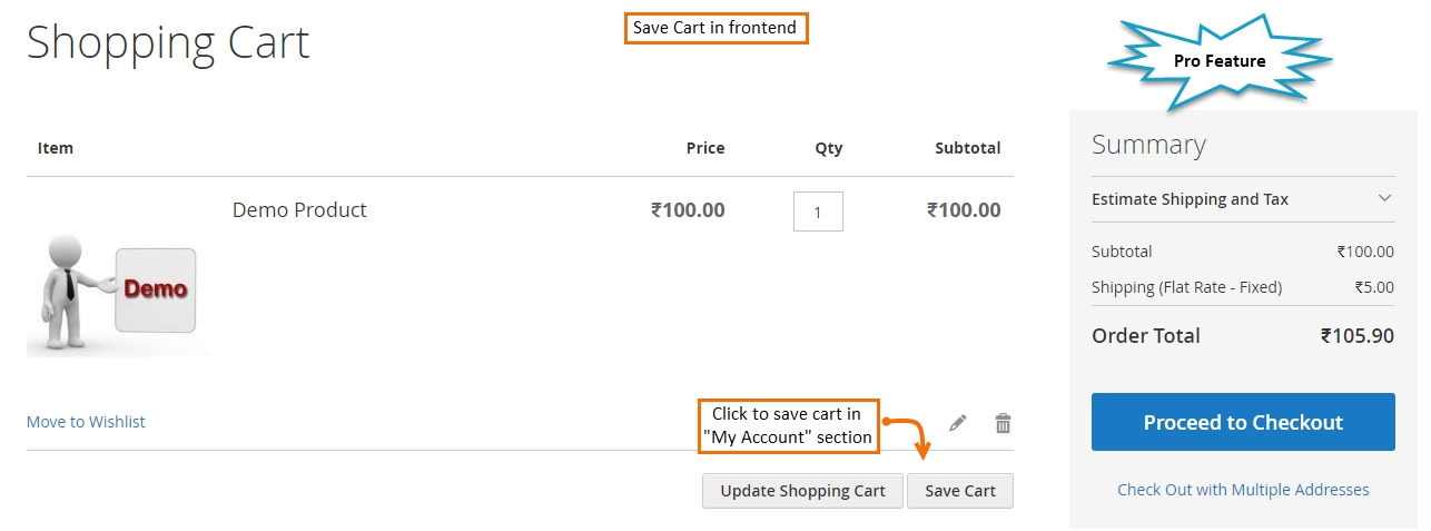 Once Save Cart Pro is configured, you can see it enabled on the frontend. When customers add products to cart and go to the cart page, they can see the “Save Cart” button enabled to save their shopping cart in “My Account” section.