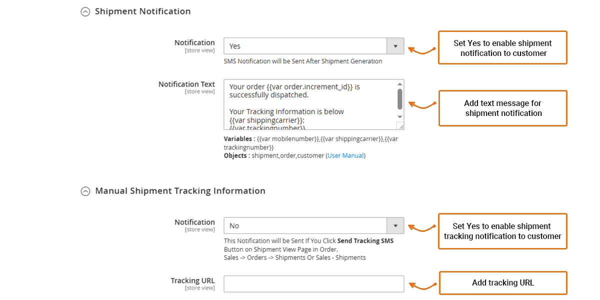 **Notification:** Select yes for sending the SMS notification to your customers for shipment tracking information notification.\