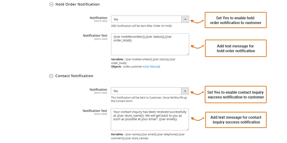 **Notification:** Select yes for sending the SMS notification to your customers when the order is on hold.\