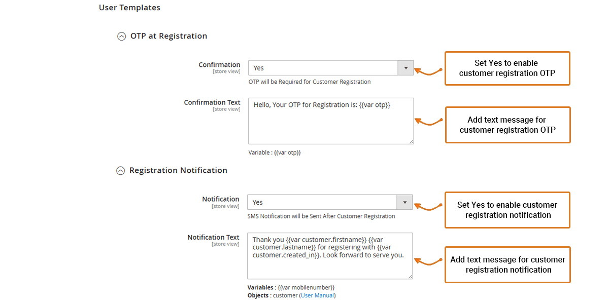 **Notification Text:** One can add their desired message which will be sent when the customers are registered successfully.