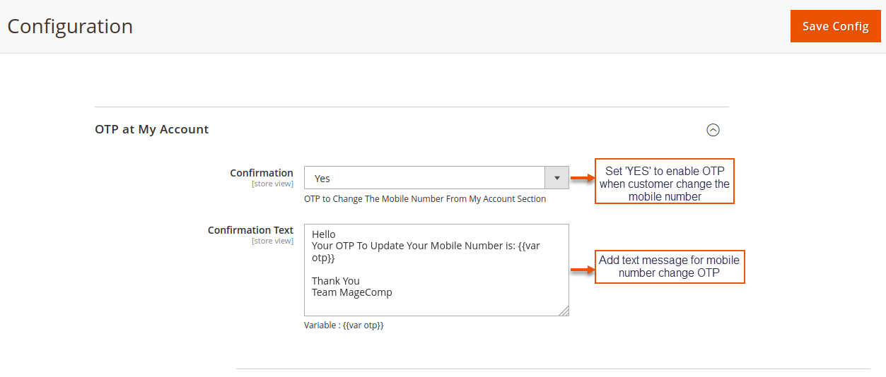 **Confirmation Text:** One can add their desired message for sending to customers for OTP confirmation.