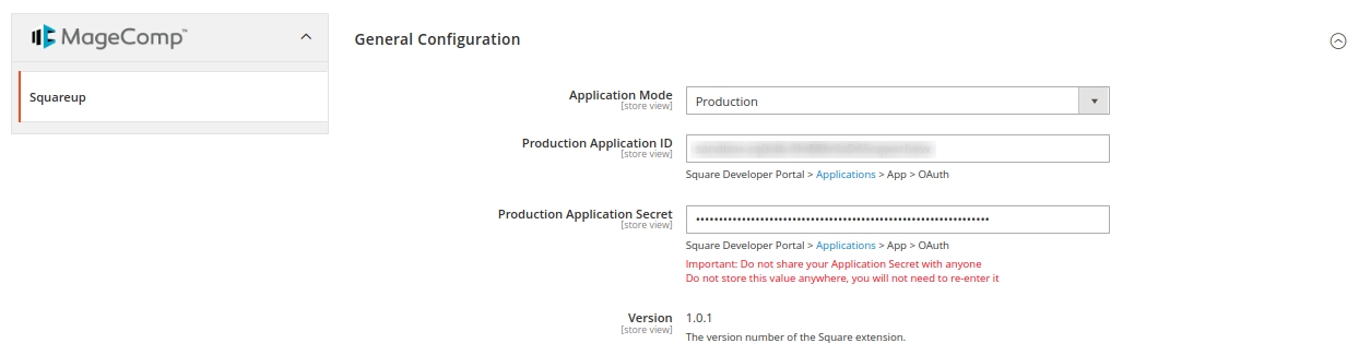 Now head on to your Magento store admin. Go to Stores > Configuration. Under the MageComp tab, select the Squareup tab. Expand the General Configuration option.