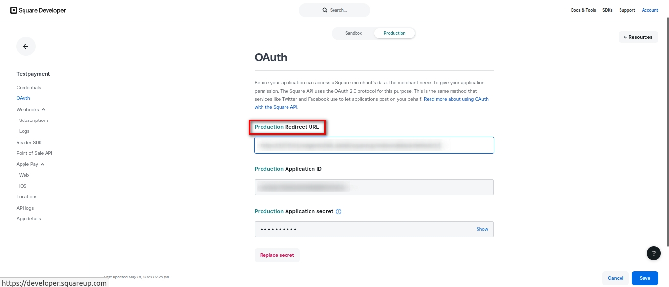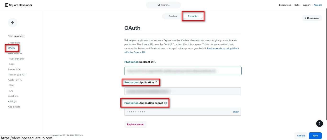 Go to the Square App you have created from your Square Account. Select Production from the top and then select OAuth from the left sidebar.