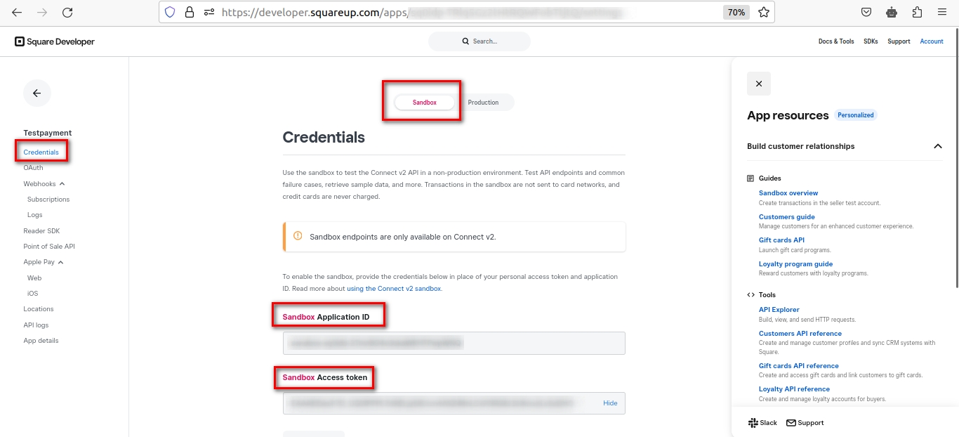 Go to the Square App you have created from your Square Account. Select Sandbox from the top and then select Credentials from the left sidebar.