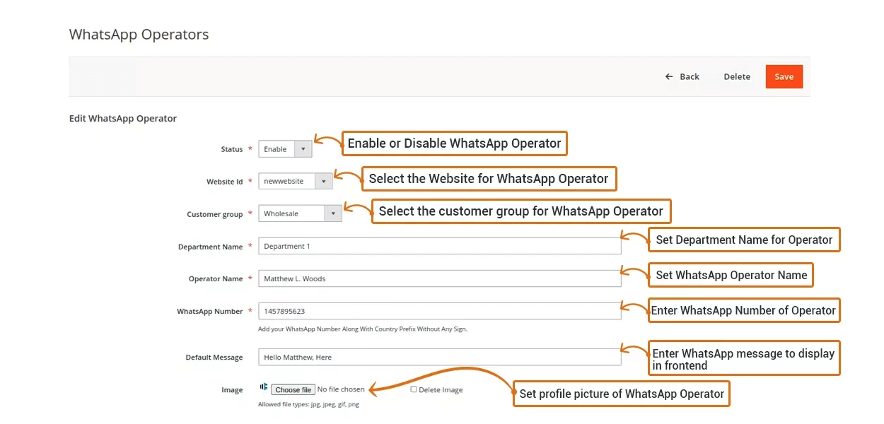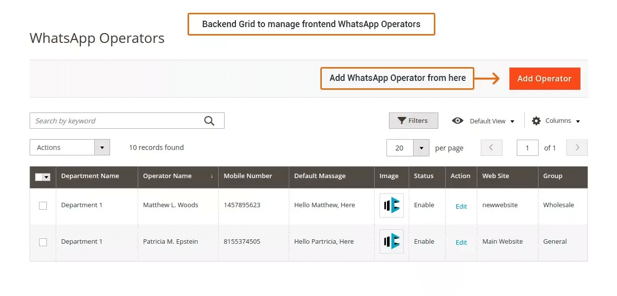 Once you have successfully configured the extension, you can now manage your WhatsApp Operators using backend grid if you have enabled the WhatsApp Operator.