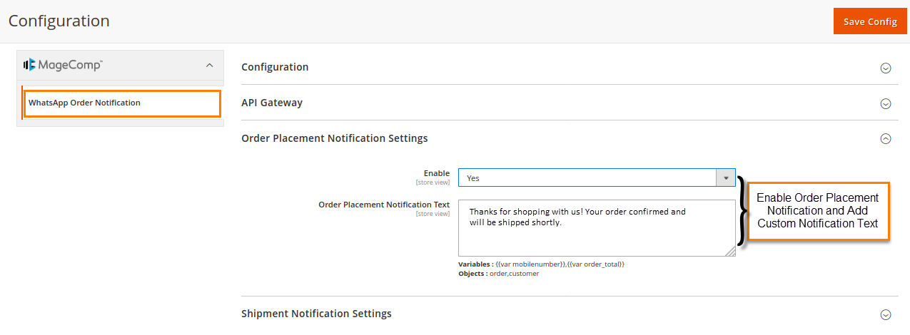 **Order Placement Notification Text:** Here store admin can add their desired customized text to send with order placement notification.
